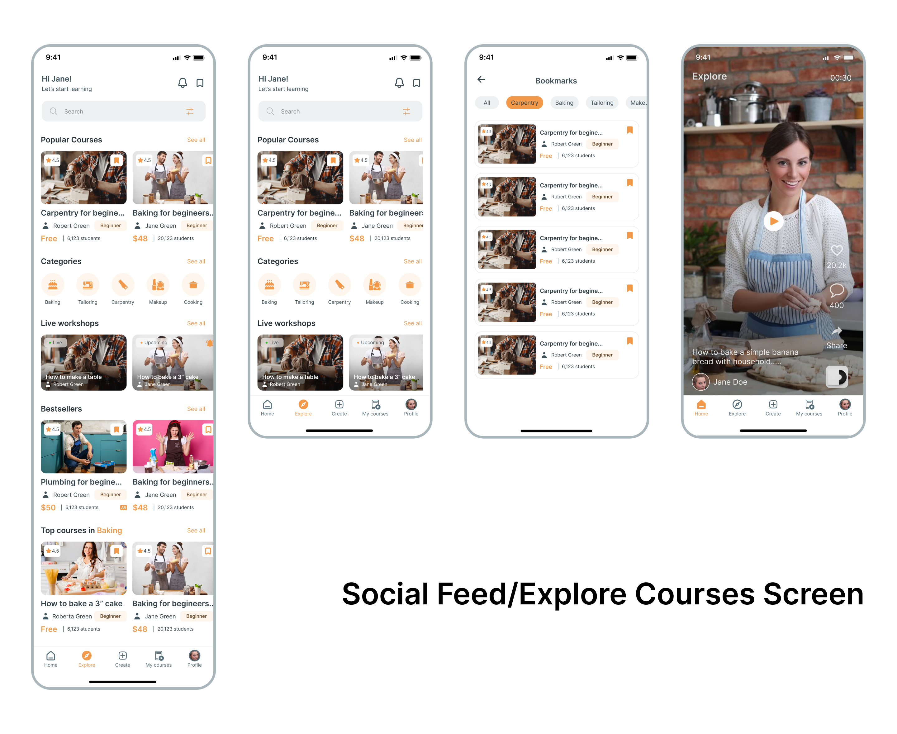 Watch the complete interactive prototype, onboarding, skill discovery, video lessons, gamification features, community engagement, and progress tracking across all 32 screens.
